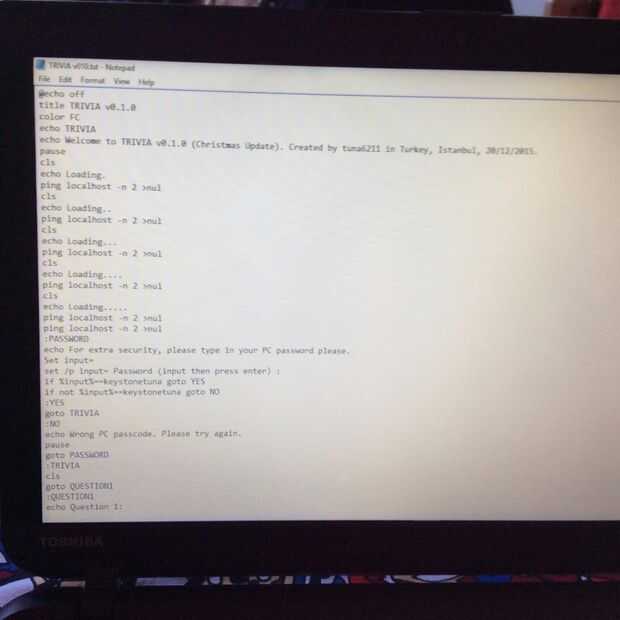 echo Bienvenido al TRIVIA v0.1.0 (actualización de Navidad). Creado por tuna6211 en Turquía, Estambul, 20/12/2015.