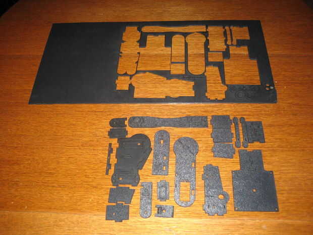Las piezas para el TROBOT están diseñadas en AutoCAD, a continuación, corte del laser de 3/16" negro ABS o acrílico hoja. Todo el diseño fue cortado de una sección de 11 "x 16" (como se muestra).