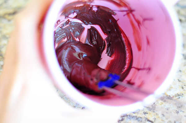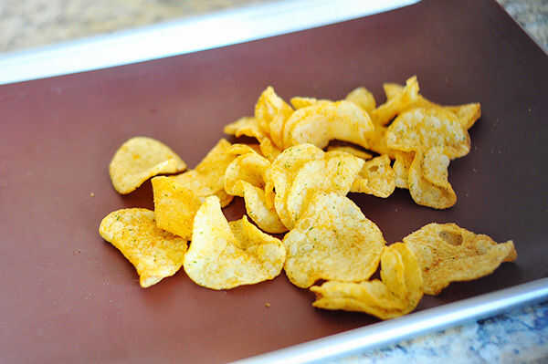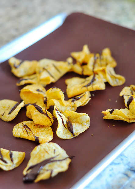 Colocar chocolate en una taza de prueba de microondas y calentar durante 30 segundos, retire y mezcle con una espátula, remover durante 30 segundos, si chocolate no se derrite suficiente calentamiento durante otros 20 segundos. No recaliente el chocolate. El chocolate es muy temperamental y se agrupan por si se calienta más. Una vez que el chocolate se derrita, repartidas chuletas en una bandeja para hornear y rocíe en chocolate. Dejar enfriar y servir.