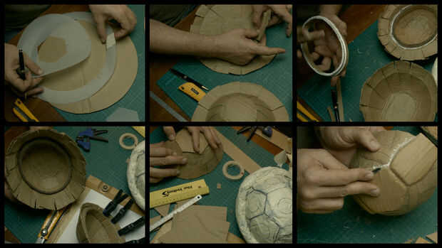 Continuación hasta aplicar los "paneles" a ambas partes de la cáscara. Utilicé un cartón más grueso para los paneles de cáscara de Top, para que ellos se realmente aumentaría hasta después de alisa los bordes. Que empezar con el panel central y luego corte cada uno posterior al ajuste que antes. Realmente tomar su tiempo para mezclar los bordes, esto realmente ayuda a lograr un aspecto más de "Esculpida".