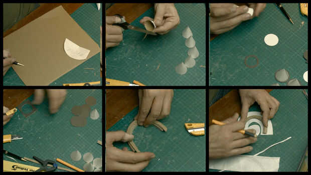 Construir las puntas con un blanco de cartón fino. En principio el cartón es rígido. Para ablandarla lo tomo y tire de ella hacia adelante y hacia atrás sobre el borde de mi escritorio. Una vez ablandada puedo rodar en un cono. Con un lápiz Marque el cono a la altura de mi agrado. "Desenrolle" el cono y cortar el cartón a lo largo de la línea que dibujó. Esta forma de cartón ahora sirve como mi plantilla que utilizo para dibujar otro seis. Cuando acabada i roll en forma de cono y pegar los solapes y alisar la costura. Usando un cortador circular de que hacer 7 discos de cartón que son 5mm más ancho en diámetro en comparación con la base de los conos. Ahora las espigas se pegan a la tapa de los discos.