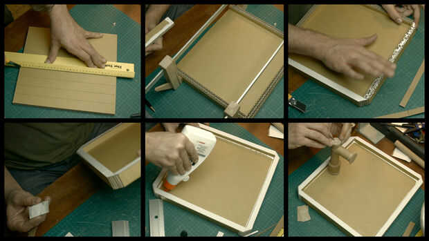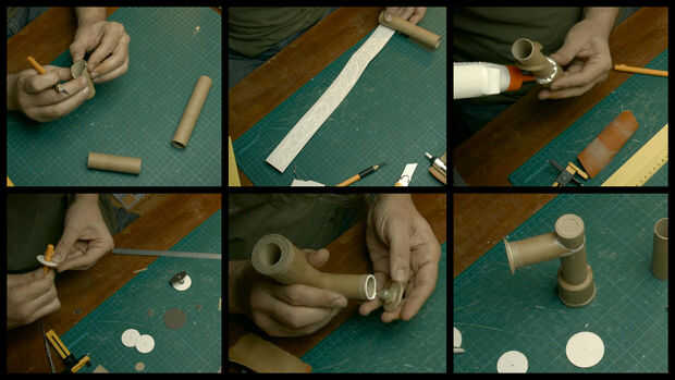 Los tubos se hicieron de un tubo de cartón que solía estar dentro de un rollo de papel de aluminio. Envolvió una franja larga de cartón para el lado del cono que iba a ir pegada al tablero. De esta forma que aumentaron el área de la cola. La parte superior de esa banda fue cubierta con papel y los bordes donde alisadas.