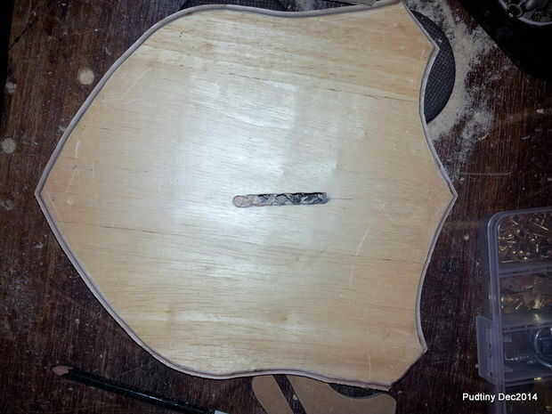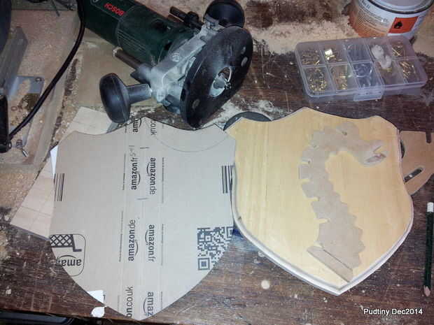 Utilizando la plantilla de escudo corta el protector de la madera de elección y contornee el borde (utilicé algunos recortes de madera de goma)