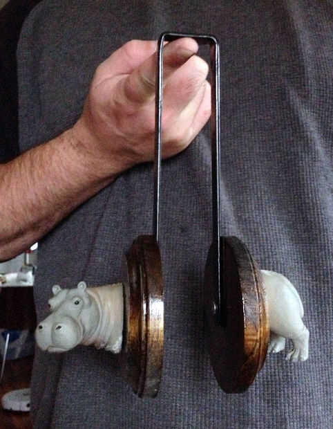 Paso 2. Comprar un juguete plástico hippo (animal de plástico o de goma o juguetes), dos de madera biselado / piezas artesanales de que (o muebles montaña/patas para ruedecilla), colorante (opcional) de madera, pintura / pintura de aerosol para metal, metal (hemos utilizado chatarra), dos tornillos (que funcionarán para metal y madera), taladro / metal tornillo broca, mano o aire Sierra y su Perchero de madera o metal.