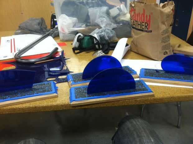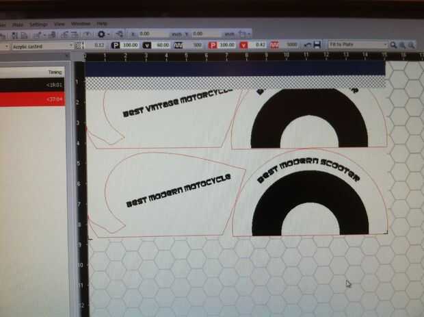 he creado hojas de una hoja de acrílico azul. He utilizado formas que están relacionadas con la tradición "Mods Vs Rockers" el icono de "Destino" y el icono de la espada. La creé así parecería que los iconos se encajan la mitad en la base de madera. También grabado el nombre de la categoría, que el premio fue para en los primeros. Estos fueron diseñados en adobe illustrator y corte y grabados con el Speedy 300 de Trotec.
