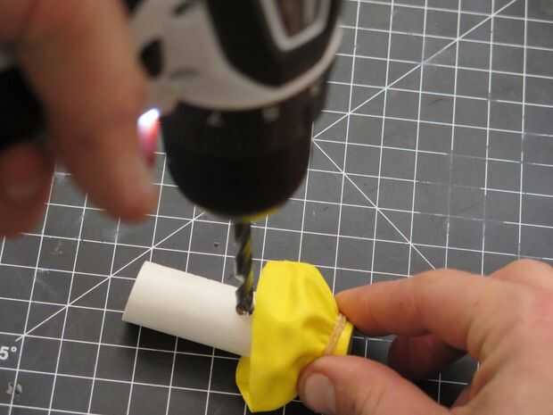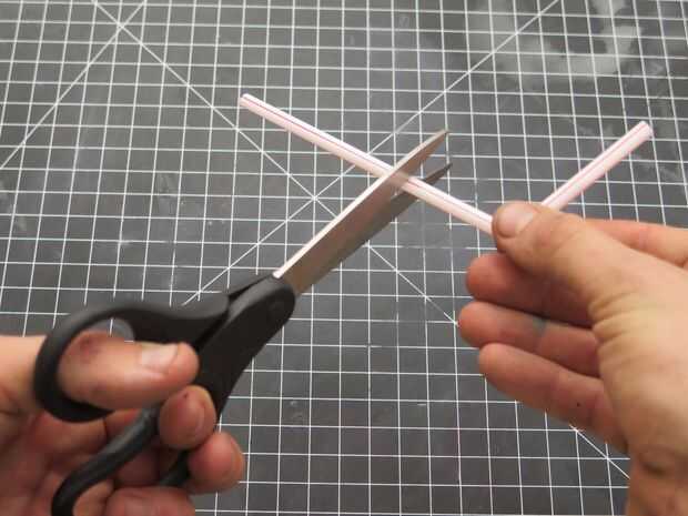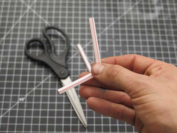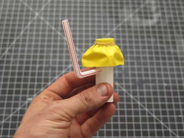 Justo debajo de la falda del globo, perfore un agujero que es aproximadamente el mismo diámetro que el flexi-pajas. Luego cortar una de las pajas de flexi por lo que ambos extremos de la misma longitud de aproximadamente incluso.