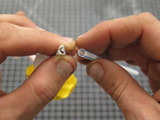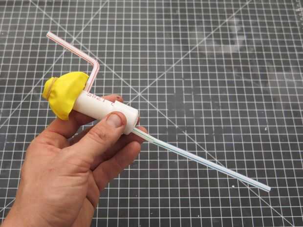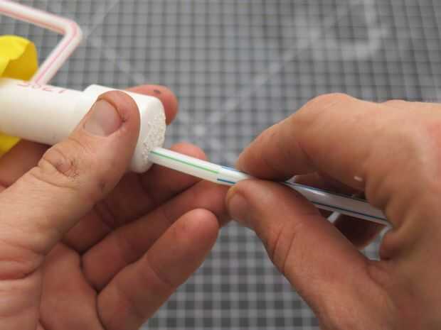 Tome su segunda longitud de corte flexi-paja y deslice en el otro. Esto alarga la longitud del tubo y ya va a cambiar el tono. A continuación se deslizan sobre la paja más grande que va a actuar como nuestra diapositiva del trombone. Mediante el ajuste de esta longitud, conseguiremos tonos de nuestro instrumento.