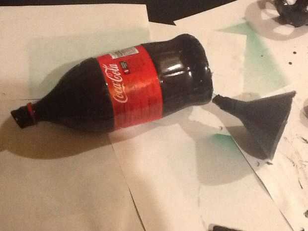 Utilice un rotulador para marcar dónde cortar el embudo. Utilizar tijeras para cortar el exceso. Con cinta adhesiva la parte inferior del embudo y coque. Tome el extremo y cortar las piezas de la parte inferior. Entonces trate de empacar el resto de la botella en la botella, luego la cinta.