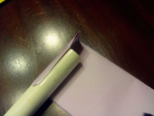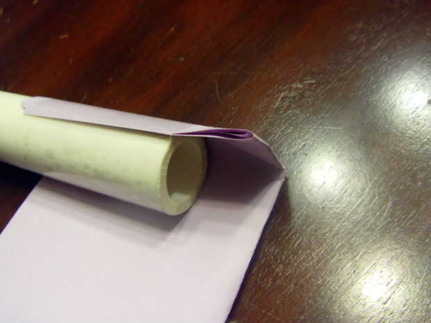 Tomar su papel y doblar dos veces, como se muestra en fotos. Luego Envuélvala alrededor de un extremo del PVC y asegure con cinta. Se trata de su boquilla.