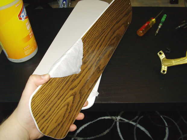 Casi todas las aspas del ventilador de techo estándar son doble cara. Es decir, un lado es imitación madera de grano y el otro es un color plano blancuzco. Ya que esto va a estar en mi oficina, más bien iría con un color más moderno para ir con mis muebles baratos de Walmart, para voltear las hojas para el lado blanco y limpiar con toallitas de clorox.