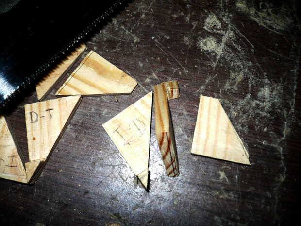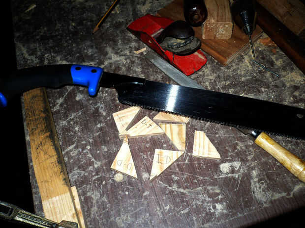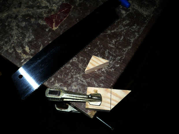 Para hacer los cortes, uso una sierra japonesa. En las escuadras "raras", se hacen dos cortes. Primero se corta el final, para dejar la punta con el grosor de la tabla de travesaño, y luego cortar por la mitad, para el grosor no sea superior de la pata.