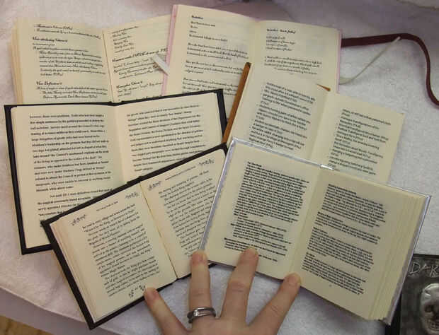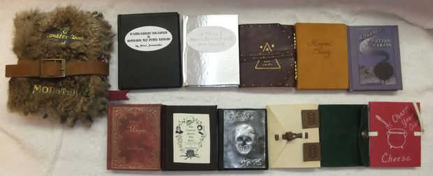 La mayoría de los libros estaban cubierta de cuero. Fabricación de la poción e historia de la magia fueron cubiertos en papel que imprimí diseños que había trabajado en Photoshop. La cubierta del libro artes oscuras hizo realzando un metal fino, llenando la parte posterior de la grabación en relieve con spackle y luego pegado a la cubierta de cuero después de secado el compuesto de juntas. La etiqueta de teoría mágica simplemente fue escrita con un marcador como la decoración de encanto su propio queso y decoraciones en oro en el libro de hechizos de Borgoña. La portada de The Tales of Beedle The Bard fue hecha por la impresión en el diseño de la cubierta en papel, pegado a la cubierta y luego pegar el cuero en con una ventana cortada fuera de él para mostrar el diseño impreso. Los dos libros con etiquetas blancas redondas fueron creados simplemente imprimir las etiquetas en papel de etiqueta blanca, les cortando y pegando a las cubiertas de libro.