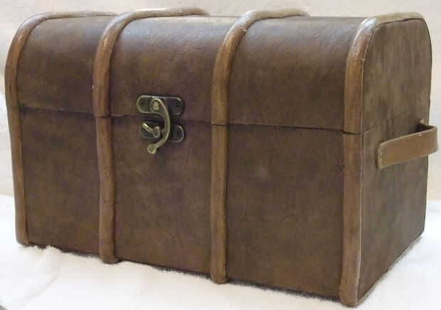 Una caja con un hardware apropiado y superior curvada fue comprada de una tienda de artesanía. El hardware fue quitado. Ajuste fue quitado y pedazos de madera y cartónLa relleno fue utilizado para hacer el tronco lo más suave posible. Un patrón fue hecho para cada sección de la caja de modo que podrían cortar pedazos de una capa de cuero para la cubierta. Algunas zonas del tronco requieren más de una pieza de cuero y estos fueron planeados para que el recorte podría cubrir juntas entre las piezas de cuero. El cuero estaba pegado a las piezas del tronco con pegamento PVA. El ajuste para el tronco fue hecho de tiras de aislamiento de espuma redonda compradas en una ferretería. Una hoja de afeitar para un caso de la maquinilla de afeitar de tipo snap-off se sujeta en un tornillo en un ángulo de 30 grados más o menos con el borde cortante en el lado más cercano a la prensa. Piezas de la espuma redonda cortada a una longitud que se envuelve alrededor del tronco + un poco más fueron entonces tiró cuidadosamente a través de la cuchilla para cortar en tiras de media caña de espuma. Estos se viraron a una pared con tachuelas de tablón de anuncios para los varios pasos. Con el fin de proporcionar una superficie que pintura se adhieren a, varias capas de pegamento PVA se aplicaron a la espuma con un cepillo un poco más ancho que la espuma y sosteniendo un trozo de cartulina detrás de la espuma con una mano mientras la pintura en la cola con la otra mano. Luego la espuma fue pintada con una pintura de arte de acrílico tan cremoso. Una capa de esmalte marrón fue aplicada y limpiarla con un trozo de una sudadera vieja (dentro de la superficie contra la espuma) para darle un aspecto de madera. Primeros intentos me mostraron que la pintura quería desprenderse de la espuma cuando se curva alrededor de los bordes del tronco o cuando la espuma se presiona lo suficiente. Me pareció que la mejor manera de lidiar con esto agregar varias capas más de pegamento PVA a la espuma antes de colocar en el tronco pero no lo suficiente que todo de la flexibilidad de la espuma estaba desaparecido. La espuma entonces fue atada al tronco con pegamento PVA y pesaje en el lugar con pesas en los tobillos mientras se secaba a cada lado del tronco. Algunas escamas de la pintura ocurrió, principalmente en las esquinas del tronco. Para solucionar esto, frota apagado cualquier pintura suelta, luego cubre esas zonas con la pintura tan cremosa y una capa de esmalte. Luego pinté toda la espuma con otra capa de esmalte para que los retoques mezclaron muy bien y la espuma se llevó un look de madera algo más oscuro y más realista. Cuando yo era feliz con la apariencia de la espuma, apliqué más capas de pegamento PVA a la espuma hasta que la espuma era duro e inflexible para que presionando la espuma ya no causar cualquier descamación. Las tiras de espuma se aplicaron todo el camino alrededor del tronco como si era una sola pieza y cuando todos los pasos se completa, la espuma fue cortada donde la parte superior e inferior del tronco se reunieron y los extremos de la espuma así expuestos fueron pintados. El hardware fue reatado al tronco. Se cortaron tiras de cuero y los bordes exteriores se reunieron en la parte posterior de la tira de cuero para hacer los bordes lisos a lo largo de los lados largos de las tiras y estas fueron fijadas a los extremos del tronco para hacer las "manijas" usando latón pequeños clavitos. Pinté el interior del tronco con pintura negro sino forro con la tela sería un buen toque.