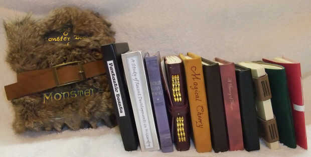El libro monstruoso de los monstruos fue construido al igual que los otros enlaces tapa dura con un papel pesado, durable para la cubierta en vez de cuero. Los dientes, lengua, ojos y tentáculos fueron hechos de arcilla polimérica utilizando el tipo "flex" para la lengua y los tentáculos. Los dientes fueron hechos y curar primero, luego las encías eran añadidas a los dientes y conectadas a la tapa con pegamento blanco y curadas. Luego hicieron los tentáculos y Unidos a la tapa con pegamento PVA y el libro fue otra vez "cocinado" para curar la arcilla. La lengua fue hecha por separado y pegada en el interior de la contraportada. Después de hecho todo el trabajo de la arcilla de polímero, la cubierta fue unida al bloque del libro. Finalmente, los ojos estaban pegados a la tapa del libro y una piel de conejo fue colocada el libro y cortada a la medida con una hendidura se corta donde se encontraban los ojos. La piel de conejo fue pegada a la tapa. Cabello fue cortado de trozos de la piel de conejo y pegado a las espaldas de los tentáculos para darles un aspecto peludo. Te recomiendo hacer todo el trabajo hecho con la piel de conejo fuera porque usted enrolla para arriba con el pelo en todo! La inscripción del libro monstruoso de los monstruos fue elaborada en photoshop de una captura de pantalla del libro de la película que encontré en internet. Luego fue impresa en papel grueso y las letras estuvieran pintando con una pintura metálica oro. El área alrededor de las letras fue pintado con una pintura gris para dar el mismo aspecto que el libro en el cine. Las piezas del título del libro se corta y el pelo de la piel de conejo fue cortado tan cerca de la piel como sea posible en las áreas donde las piezas del título fueron a colocarse, con frecuencia de comprobación de la colocación y teniendo cuidado de no cortar demasiado el pelo. Las etiquetas del libro entonces fueron pegadas en su lugar con pegamento PVA. La correa se hace cortando una tira de un pedazo de cuero nuevo de herramientas pesadas y una hebilla reciclada de un cinturón de la tienda de segunda mano.