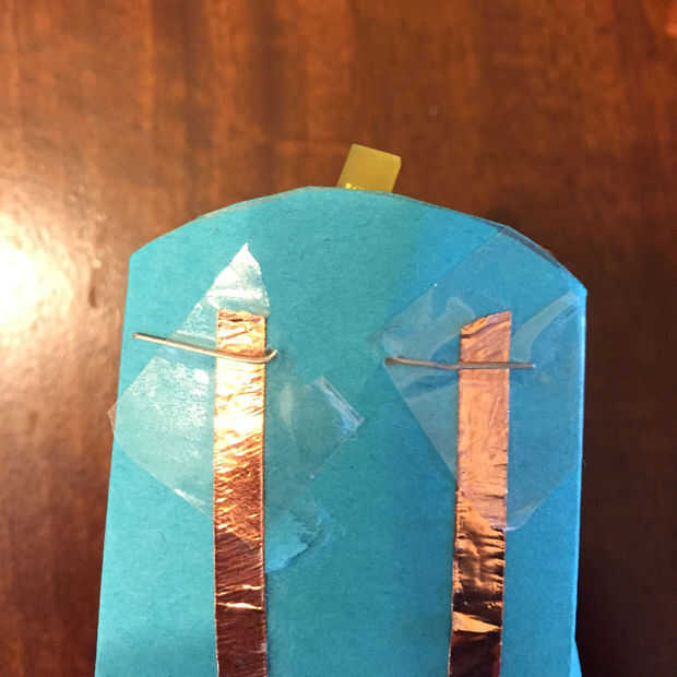 Agregar una luz LED en la parte superior del trono por meter las patas ánodo y el cátodo a través del papel de la parte delantera del trono en la parte posterior. Doblar las piernas de la luz hacia abajo y hacia fuera plana en la cinta de cobre. Cinta adhesiva de las patas del LED hasta la cinta de cobre.