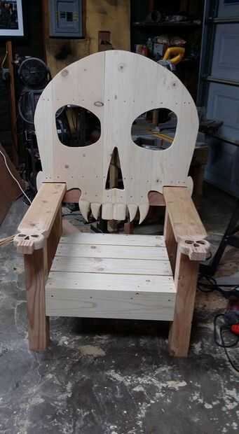 Primer cartel de tiempo. Había visto una silla similar flotando alrededor de Facebook para un par de meses y mi hija le preguntó si pensaba que podría hacer uno. Deseo que había tomado pix más como he construido, pero encontré mi surco y creado este fuera una pila de madera que tenía en mi pila de proyecto en el garaje. Las calaveras en los brazos fueron a mano alzada tallado con una herramienta Dremel, flameado con una botella de gas mapa,, luego lijar. Los dientes están en forma y contorno. La silla es 53" T y el asiento es 24" W x 23 "D. He dejado sin terminar por el momento. Yo no puedo decidir si quiero teñir o pintar. Espero que les guste.