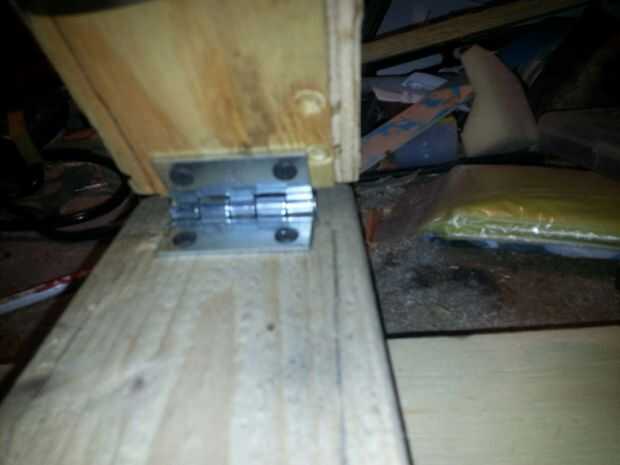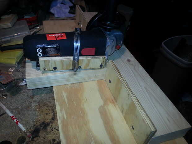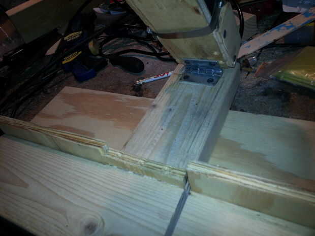 Esquema: es una forma de T de 2 x 4 adjunto a la madera contrachapada. en el extremo corto de la T hay una bisagra que hace pivotar una cuna con una amoladora.