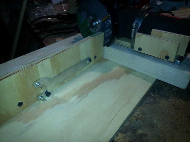 La bisagra se fija a la pieza de 2 x 4 que es perpendicular a la mesa de corte y luego la cuna de la amoladora. Es muy importante que la bisagra y la amoladora esté muy a la guía para los cortes cuadrados.