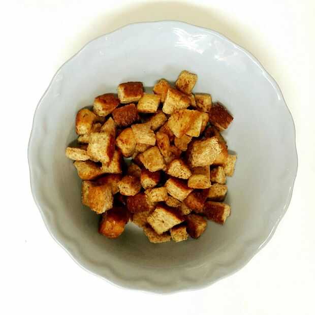 (a) utilizando una cuchara de madera rápidamente tomar pan cubos de pan y colocarán en un bol.