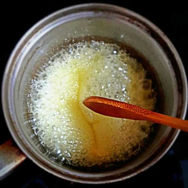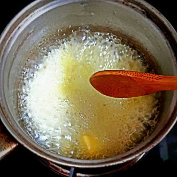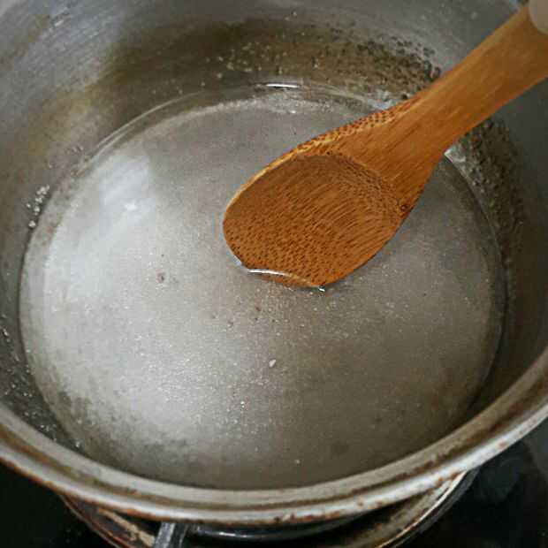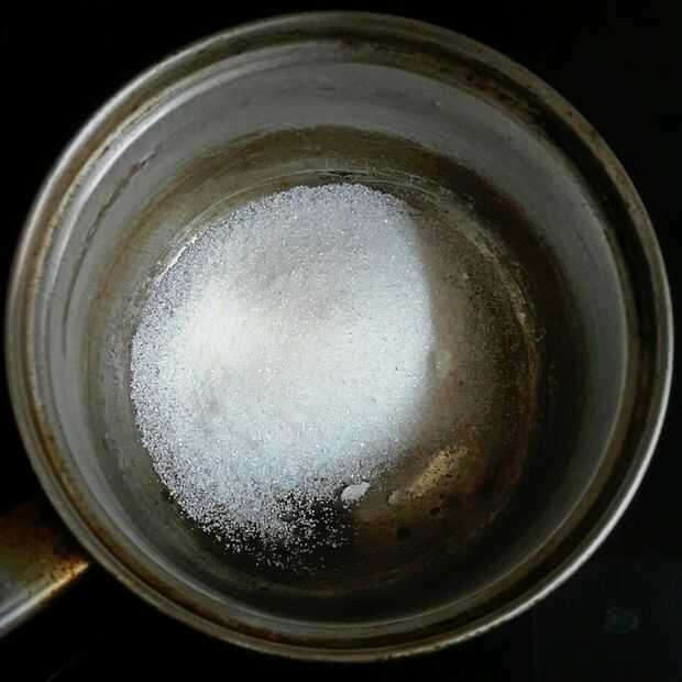 (c) cuando el azúcar comience a hervir, dejar de revolver. Girando la sartén de vez en cuando, hasta que la mezcla vuelve de un color ámbar profundo.