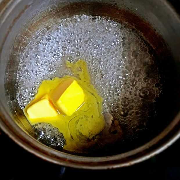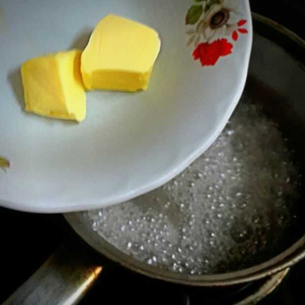 (d) agregar mantequilla y cocinar mientras batir suavemente durante 1-2 minutos, hasta que se ponga más gruesa.
