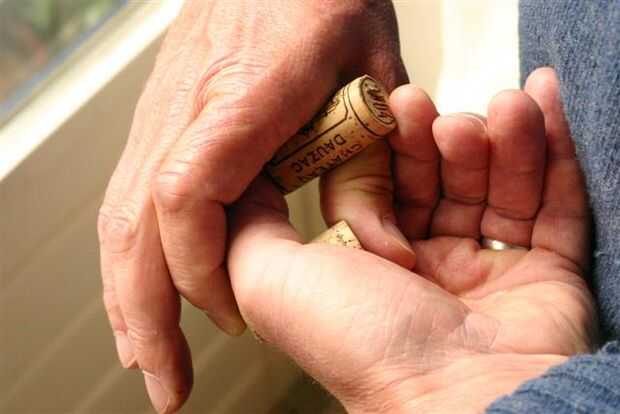 Ponga su pulgar y el dedo índice en los extremos del corcho en la mano derecha.
