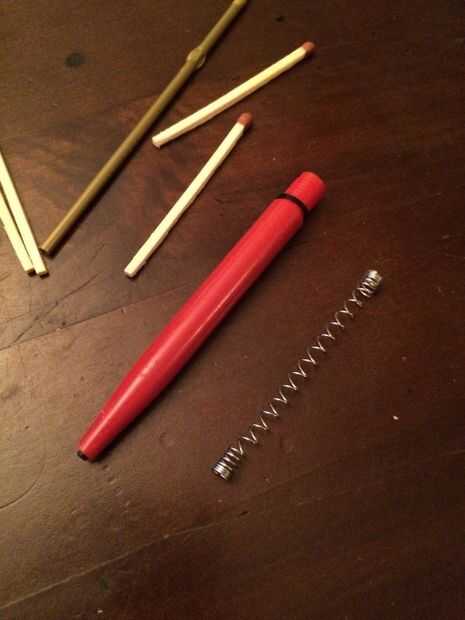 Abrir la pluma, por lo general, extrayendo las partes superiores e inferiores, sacar la varilla del interior del bolígrafo, el resorte de la parte puntiaguda de la pluma. Puede que necesite meter y jugar un poco para sacarla. Estirar el resorte con la mano a áspero dos veces su longitud original.
