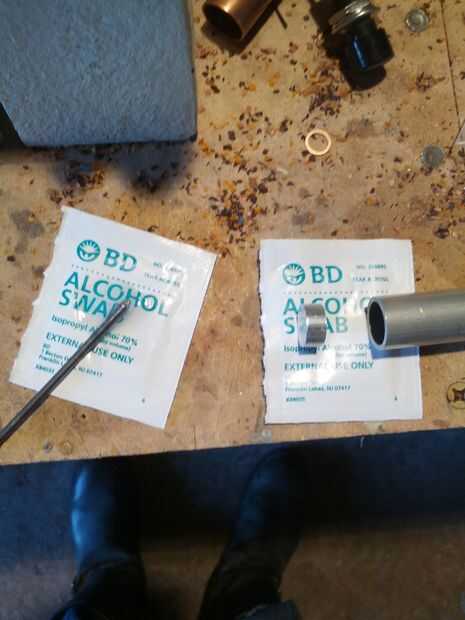 Para hacer los tubos de la leña, cortar dos tramos de tubería de aluminio 1/2" ID que son cada 2 3/4" de largo. Corte dos pedazos de la varilla de aluminio que son. 230" de largo. Pueden ser un poco más cortos, pero si son más largos que esto puede bloquear la bujía de ignición del papel flash. Pegue una sección de varilla de aluminio en un extremo del tubo, tratando de mantener nivel con el tubo de aluminio. Dos de estos tubos de tiro deben hacerse. Usé un archivo para limpiar el pegado final de cada tubo de tiro para darle un aspecto más limpio, pero esto no es estrictamente necesario.