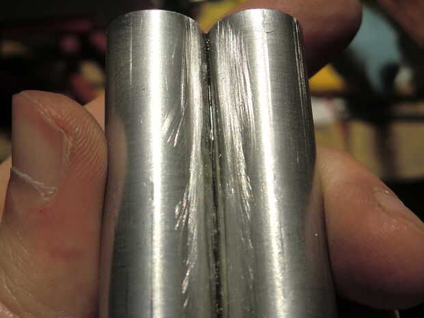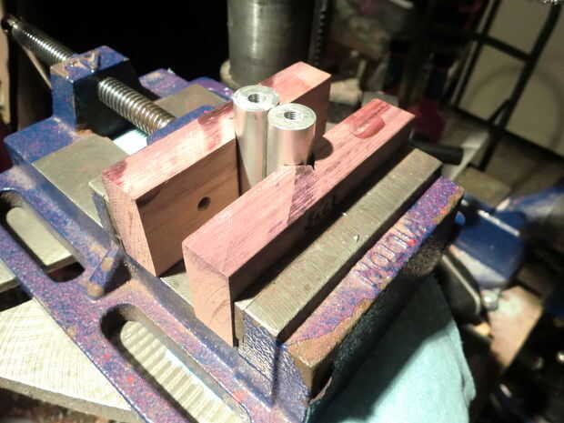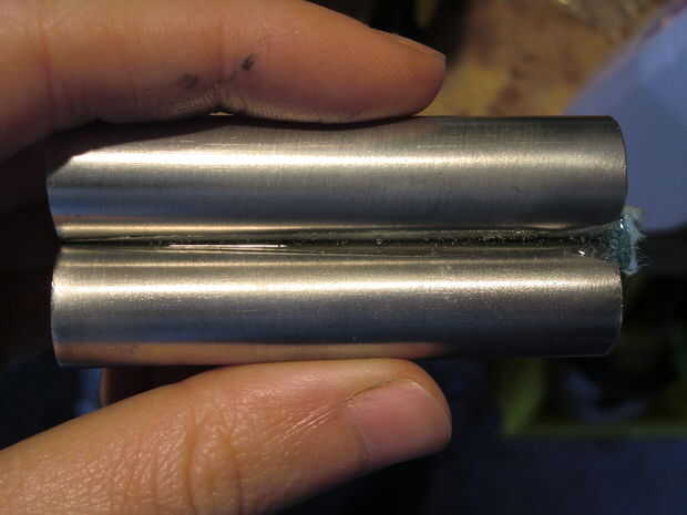 Para montar los dos tubos de fuego, áspero el área donde los tubos se pondrá en contacto con una lija de grano áspero (alrededor grano 100-300), aplique el pegamento elegido (utilicé LocTite 5 minuto epoxy) en el área rugosa y sujetarlos juntos. Asegúrese de que los tubos estén alineados al sujetar. Usé dos bloques en v en mi vicio de taladro para alinearlos. Incluso con los bloques en v, sin embargo, su alineación tuvo que ajustar manualmente un poco cuando les de sujeción.