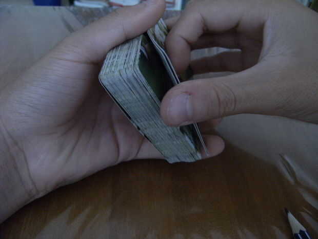 Foto 2: Debe mirar como si sólo están sosteniendo una tarjeta - la tarjeta superior. No mire en la tarjeta. Sólo se muestran. Esto es sólo para mostrar cómo se ve como si mantengo solamente 1 tarjeta. Cuando van 'whoa!' o 'lame', vuelva a colocar las dos tarjetas (aún pareciendo uno) volver al principio. La primera carta debe ser ahora la tarjeta trucada.