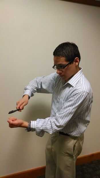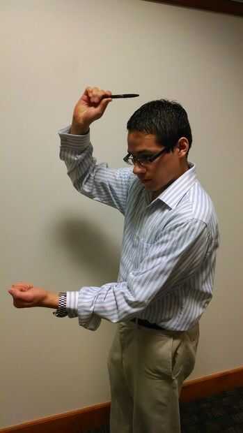 Golpear puño con pluma tres veces (Asegúrese de usar los movimientos de brazo grande) pero después de la segunda vez almacenar pluma detrás de oreja discretamente, volviendo con la mano abierta.