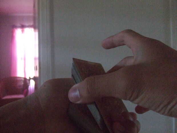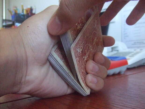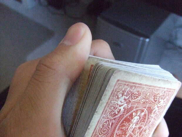 Rifa abajo a tanto como el espectador quiere. Cuando él o ella dice stop, quite la parte superior, pero!!! porque los 3 dedos son cubierta mucha de la primera carta, cuando salga la parte superior, la carta de arriba debe permanecer allí mientras que la parte superior sale de la cubierta.