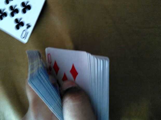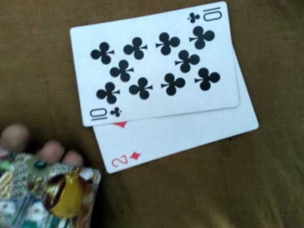 Mis tarjetas dos eran diez de Bastos y 2 de diamantes. Manténgalos separados durante un minuto. Dile al espectador otra vez a decir stop cuando rifa (si no sabes cómo rifa, decirles que al elegir un lugar entre dos tarjetas). ¿Ver secretamente la carta que está boca arriba (ver no ilustración 2), mi fue? de diamantes. La cara de la tarjeta, de 10 de diamante (digo 10 de diamantes sólo para referencia, puede ser cualquier tarjeta, sólo viendo el color es importante) es rojo por lo que tenemos que poner nuestra tarjeta roja (2 diamantes) y luego el negro uno (10 clubes). De esta manera se destruye la alternancia del roja y negra para esas dos cartas particulares como estamos poniendo la tarjeta roja (2 diamantes) sobre otra tarjeta roja (10 de diamantes) en lugar de la tarjeta negra (10 clubes). Por lo tanto para esa zona el arreglo es: