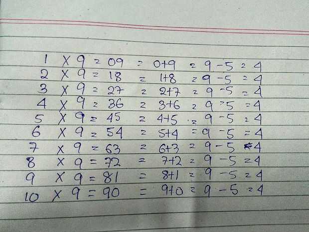 Le invito a elegir un número entre 1 y 10. Luego multiplique con 9. Luego pedir que agregue los dos dígitos del número si la respuesta resultante es un número de 2 dígitos. De esta manera la respuesta seguramente va a ser nueve (ver imagen). Le invito a restar 5, entonces la respuesta resultante será 4. Le dicen para convertirlo en un alfabeto.