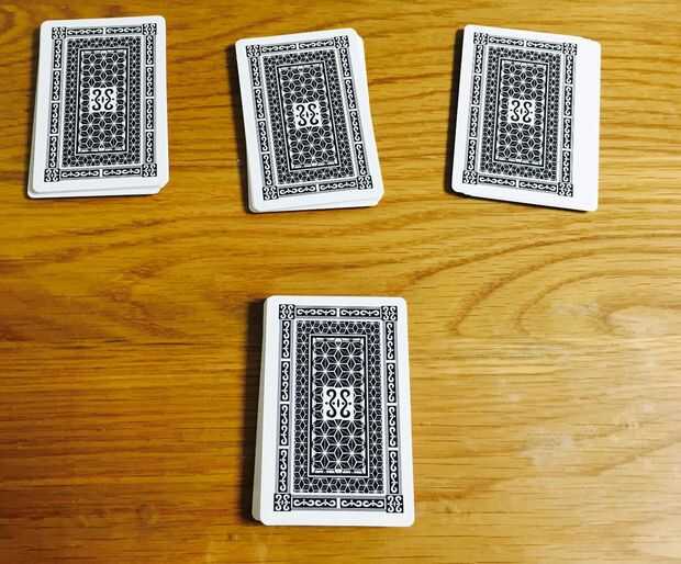 truco de tarjeta fácilPaso 1: tomar todos gatos, ases, Reyes y reinas de la baraja.  puso en sus pilas.Paso 2:colocar las tomas dePaso 3: establecer las reinasPaso 4:establecen los ReyesPaso 5: establecer los asesPaso 6: ahora debe haber cuatro pilas