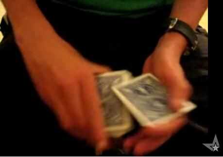 -algunas cartas de la parte inferior de la cubierta con su mano izquierda y llevarlos a la cima y tomar todas las cartas por debajo del pulgar rompen (así el dedo pulgar está ahora en la parte inferior de la cubierta) y llevarlos a la parte superior. La tarjeta espectadores debe ser encima de la cubierta.