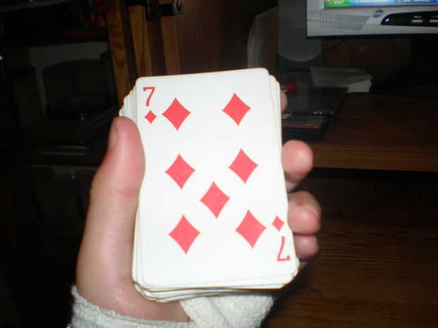 tomar el mazo de cartas y preguntar a alguien para examinar y los shuffle. cuando que de la mano las tarjetas de nuevo te, hacer un shuffle rápido así. Cuando encuadre las tarjetas discretamente miren la tarjeta de abajo y recuerdan, en este caso es el 7 de diamantes.