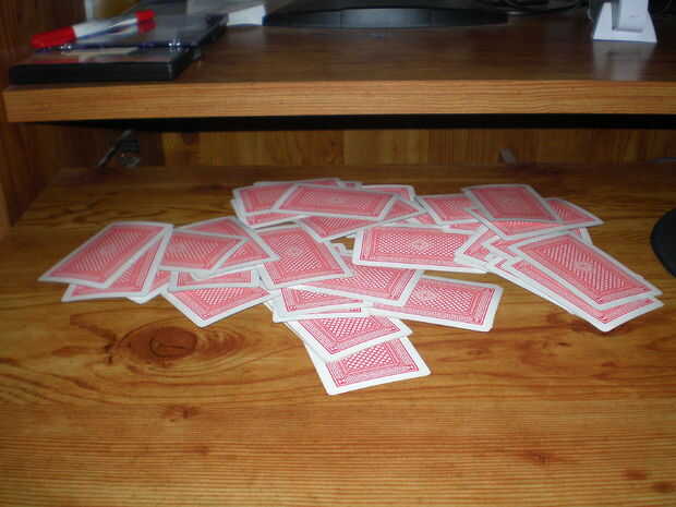 truco de tarjeta fácilPaso 1: tomar todos gatos, ases, Reyes y reinas de la baraja. puso en sus pilas.Paso 2:colocar las tomas dePaso 3: establecer las reinasPaso 4:establecen los ReyesPaso 5: establecer los asesPaso 6: ahora debe haber cuatro pilas