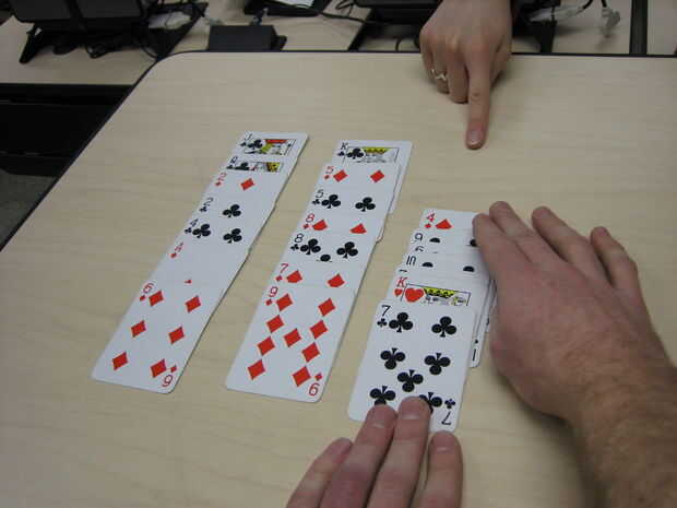 truco de tarjeta fácilPaso 1: tomar todos gatos, ases, Reyes y reinas de la baraja. puso en sus pilas.Paso 2:colocar las tomas dePaso 3: establecer las reinasPaso 4:establecen los ReyesPaso 5: establecer los asesPaso 6: ahora debe haber cuatro pilas