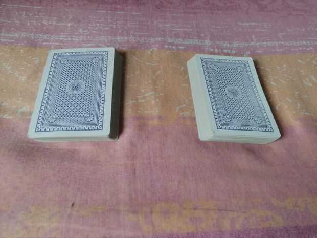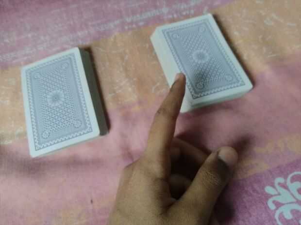 Dividir la baraja en dos mitades. Mantener un ojo en el la mitad superior donde se encuentra la cuarta carta (2 diamantes) ahora Dile al público que al tener un vistazo a la cuarta carta de este medio (la mitad inferior) puedo decir u la cuarta carta de la mitad (2 diamantes).