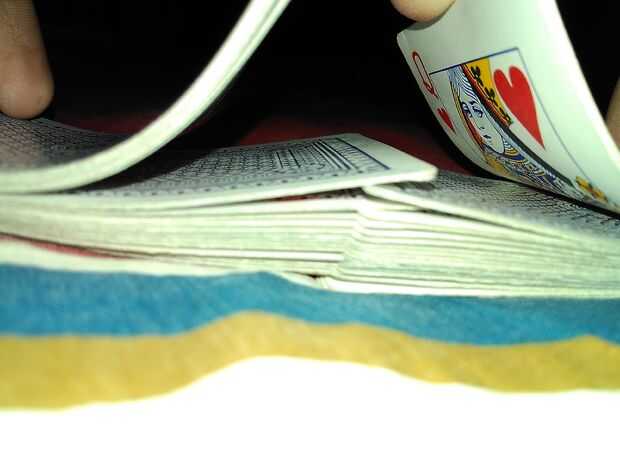 Ahora olvidar el 2 de diamantes. Recuerda 2 de picas ♠. Shuffle los dos las mitades. Mantener un ojo en el dos de espadas. Necesita rifa barajar las cartas. Cuando haces debe tener en cuenta que usted tiene que tener más de cuatro o por lo menos cuatro cartas de la parte inferior la mitad en la parte superior. En otras palabras, cuando rifa a través de las tarjetas, usted necesita rifa la mitad superior un poco más rápido que la mitad inferior que todas las cartas de la parte superior caigan hacia abajo antes de la mitad inferior hay más de cuatro cartas de la parte inferior la mitad en la parte superior. Se puede ver en la imagen que tengo más de cuatro cartas, tal vez 10 o 15. Así que ahora, la cuarta carta de la baraja es 2 de espadas.