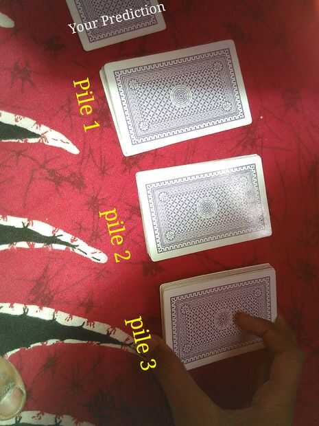 Ya que había un arreglo o configuración de las tarjetas, la tarjeta superior de la cubierta debe ser el 5. Por lo tanto, utilizar las primeras cartas como pila 1, medianas tarjetas como pila 2 y el resto de cartas como pila 3. De esta manera la carta de arriba o decir los arreglos eso u en la primera será en la pila 1.