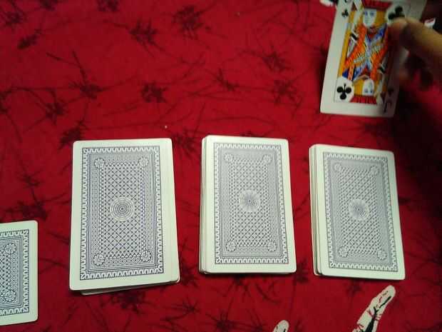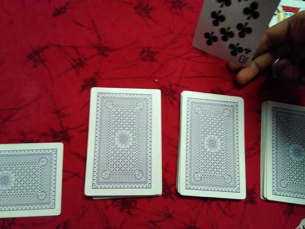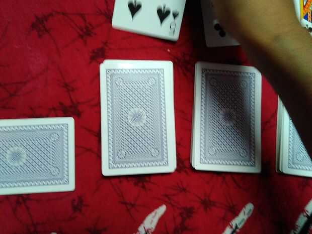 truco de tarjeta fácilPaso 1: tomar todos gatos, ases, Reyes y reinas de la baraja.  puso en sus pilas.Paso 2:colocar las tomas dePaso 3: establecer las reinasPaso 4:establecen los ReyesPaso 5: establecer los asesPaso 6: ahora debe haber cuatro pilas
