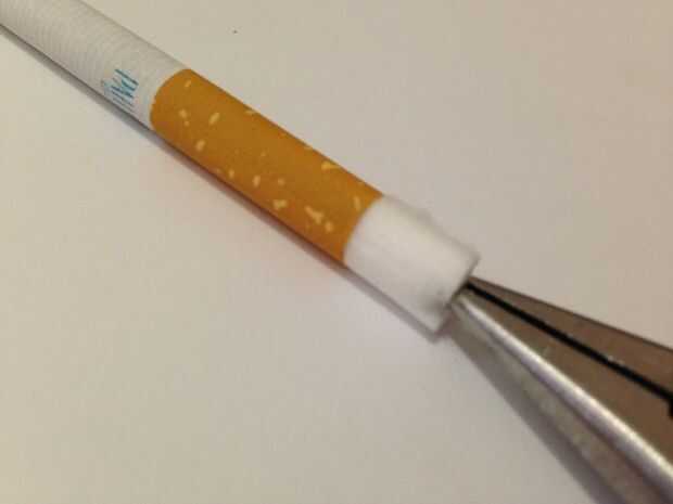 Saque el filtro de un cigarrillo con las pinzas y suavemente el rodillo hacia fuera el tabaco.