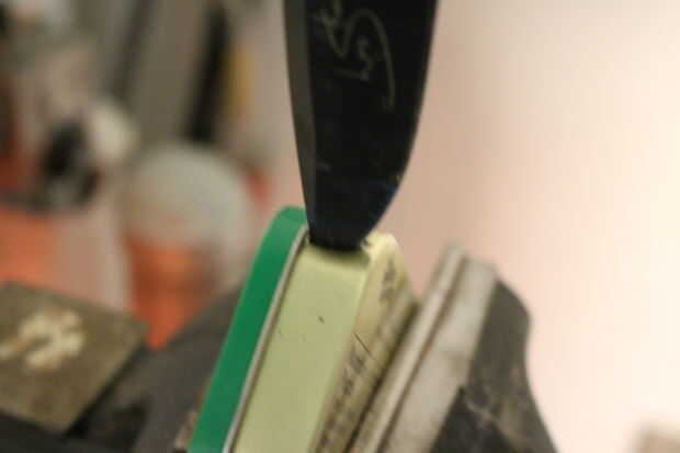 Ponga la lata Altoids con la esquina marcada hacia arriba y golpee suavemente el cuchillo con el mazo para empujar los agujeros.