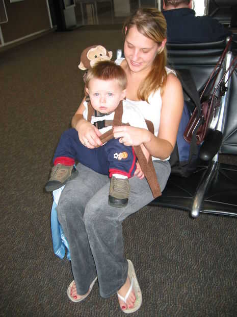 De Hayden lleva un arnés y correa. El arnés tiene una mochila incorporada que se parece a un mono en su espalda. La correa es cola de mono.