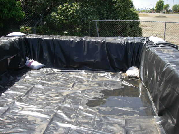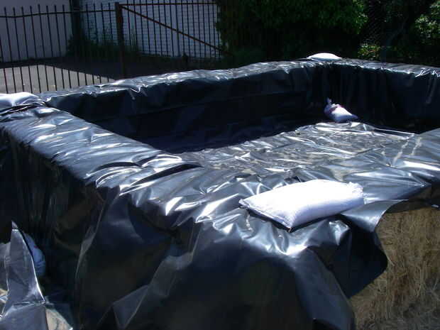 Hay grandes grapas aferrarse el plástico alrededor del borde y sacos de arena manteniendo dentro y alrededor del borde.