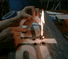 Así que enciende una tira de desecho p-tex en fuego y goteó en los orificios hasta que estaban llenos. Luego me presentó y lija plana. Entonces lo había encerado. Entonces fui hacer snowboard.