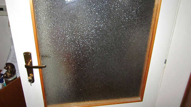 Este efecto se realiza mediante algún tipo de cristal textured que es cortar un círculo y gira lentamente frente a la láser.