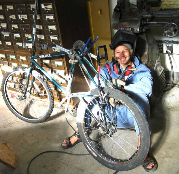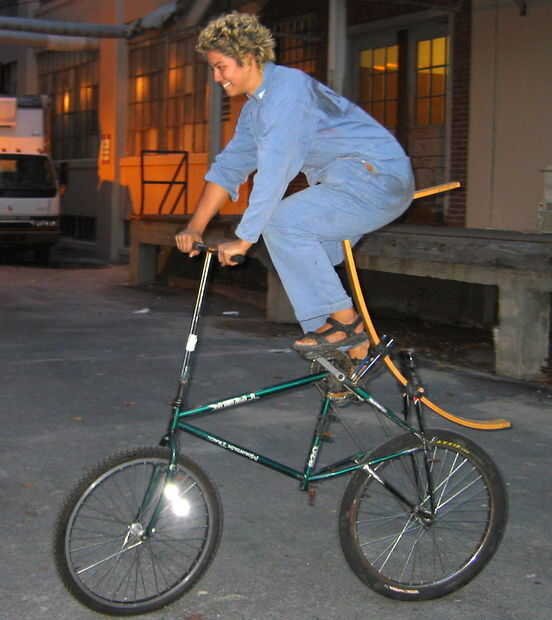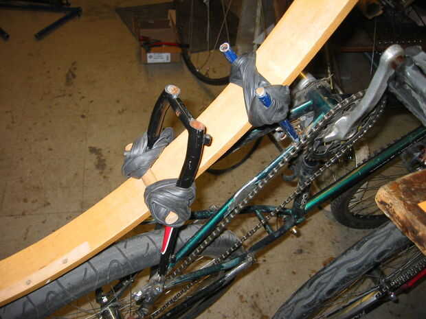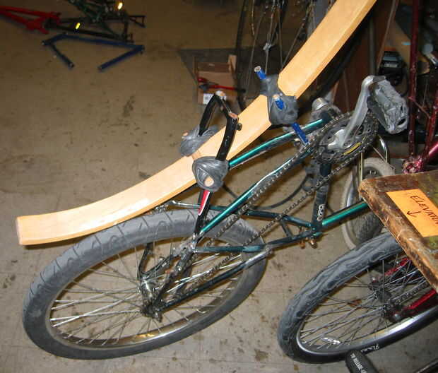 Hicimos este uno usando el brazo de una silla danés para hacer una tija de sillín elástico y una defensa al mismo tiempo. Es azotado innertube en algunos soportes que soldada de tubos de whatchamacallit "vaina". La moto parece que ha hecho en un pantano.